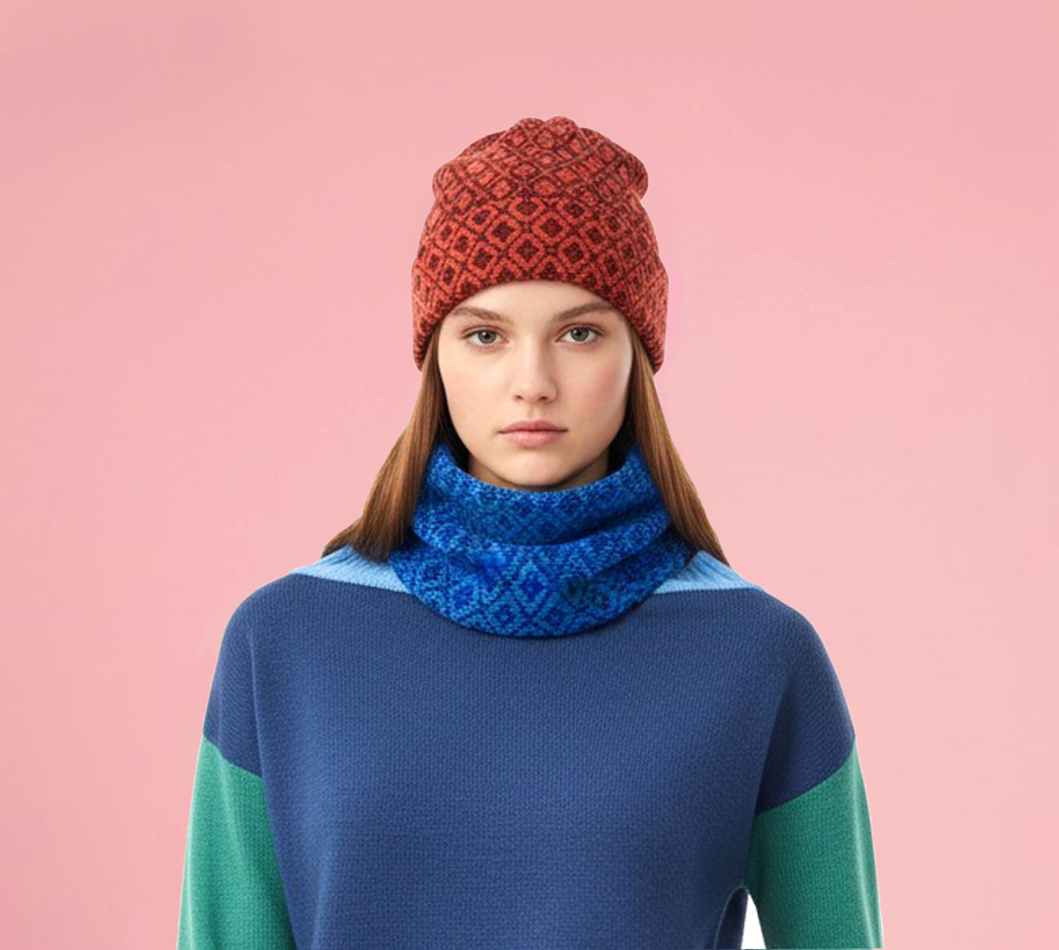 Women’s knitted Diamond fairisle reversible tube scarf. Machine knitted in 100% Merino yarn, handmade in County Donegal, Ireland.
